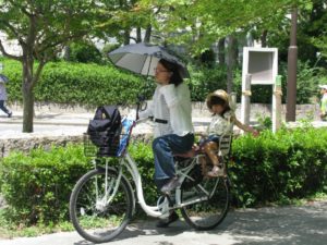 Il nous semble qu’une famille japonaise classique ne possède qu’une seule voiture, la deuxième étant remplacée par un vélo souvent à assistance électrique équipé de façon à pouvoir transporter les jeunes enfants et/ou les commissions. Ils sont vraiment très nombreux en ville où combinés avec des transports en commun efficaces et une bonne infrastructure routière les encombrements sont quasiment inexistants.
